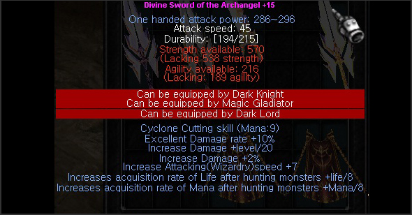 Increase Damage + level/20 / Increase Attacking(Wizardry)speed + 7- Excellent Knight Blade +9 / One-Handed Damage: 158 ~ 166